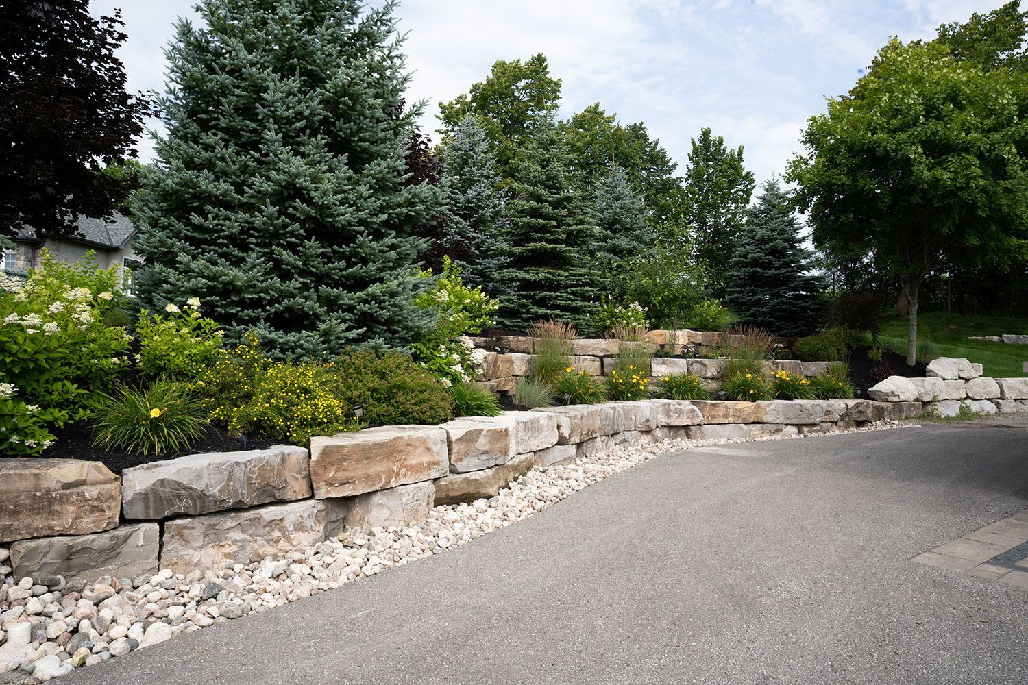 This led to the creation of two seperate natural stone retaining walls as well as an interlock path leading to the backyard.